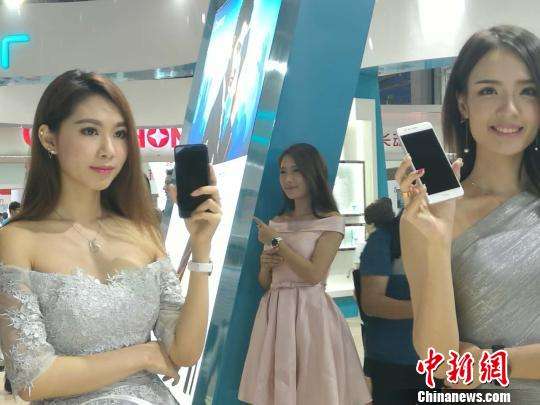 资料图:“2016年天翼智能终端交易博览会”上模特在展示智能手机。唐贵江摄