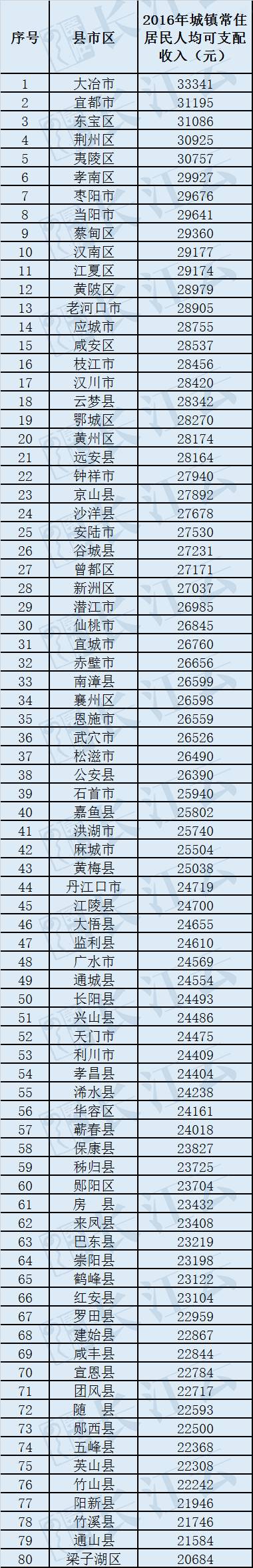 《2016年湖北省县域经济工作考核报告》也列出了湖北80个县(市、区)2016年居民人均可支配收入数据。2016年,湖北县域城镇、农村常住居民人均可支配收入分别达到26632元和13176元,比上年增长9.0%和7.9%。