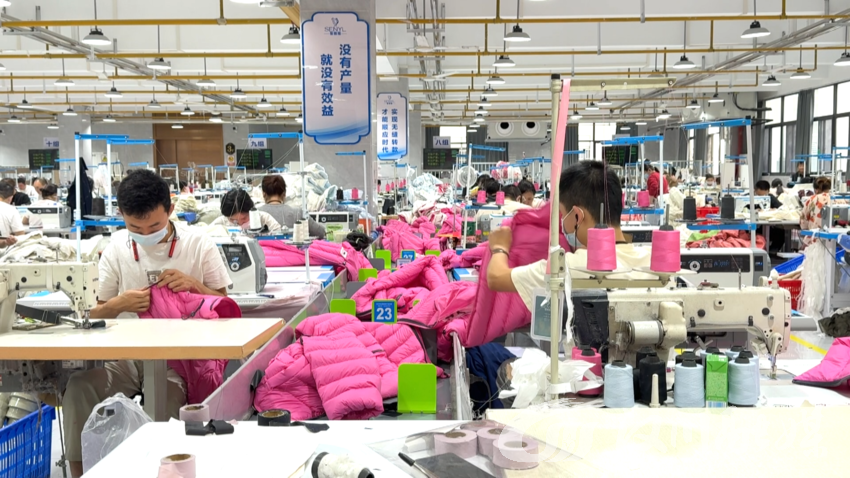 10月27日,汉川经济技术开发区浙商产业园圣雅隆服饰的生产车间内,10条流水线有序运转,500余名工人正加紧生产羽绒服产品。一件件成品经过质检、打包,陆续发往全国各地商超及电商仓储网点。