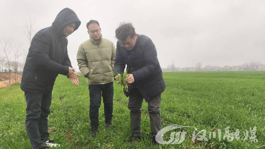 1月19日,湖北省农业技术推广总站正高级农艺师汤灏军深入汉川市中洲农场、沉湖镇小麦主产区,开展冬季苗情调度与寒潮应对技术指导。