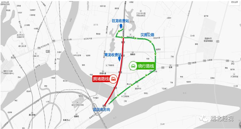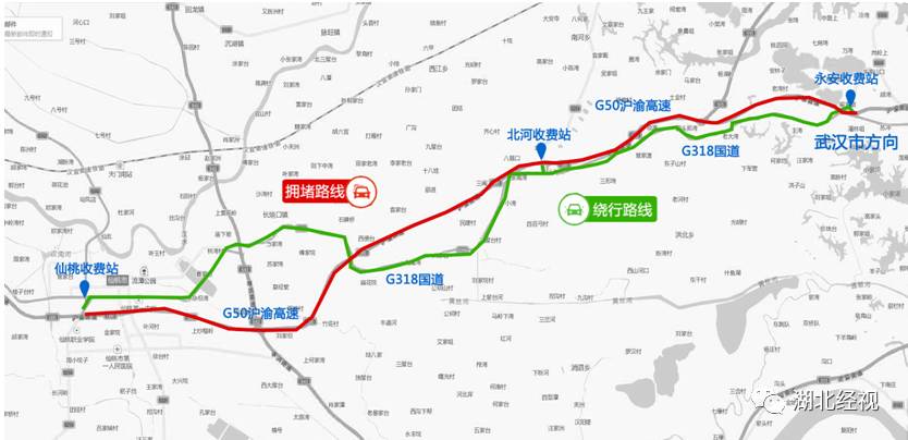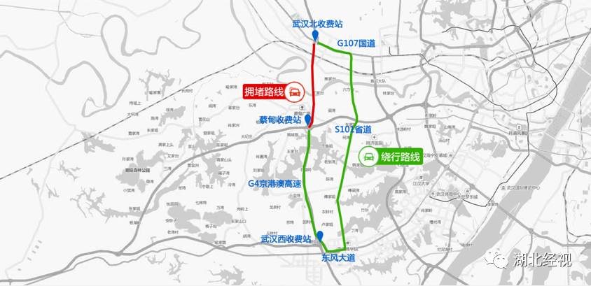 绕行路线:沪渝高速渝沪方向行驶的车辆,从武汉西收费站下站,行驶东风大道行驶至S101省道,再驶入个G107国道进入武汉北收费站。