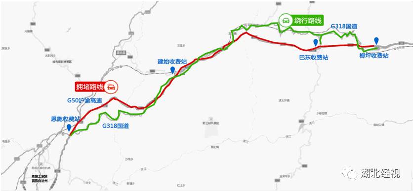 绕行路线:沪渝高速宜恩方向车辆从榔坪下站,行驶G318国道,从恩施收费站上站。返程也可以选择此绕行路线。