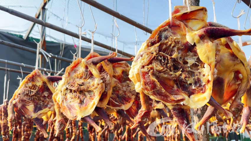 走进栗山小镇,晾晒区挂满了腊肉、腊鸭、腊鸡和腊肠,阵阵咸香扑鼻而来。这些年货均来自小镇的栗山秀种养殖家庭农场,采用散养土鸡、七彩山鸡等家禽,遵循传统工艺腌制,保留了食材的原汁原味。