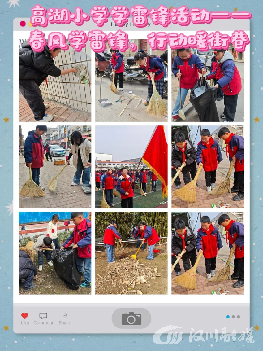 高湖小学学雷锋月系列活动启动仪式简洁庄重,结合雷锋事迹进行宣讲。仪式后,少先队员们立即投入街道清扫实践,在劳动中感悟雷锋精神的时代内涵。
