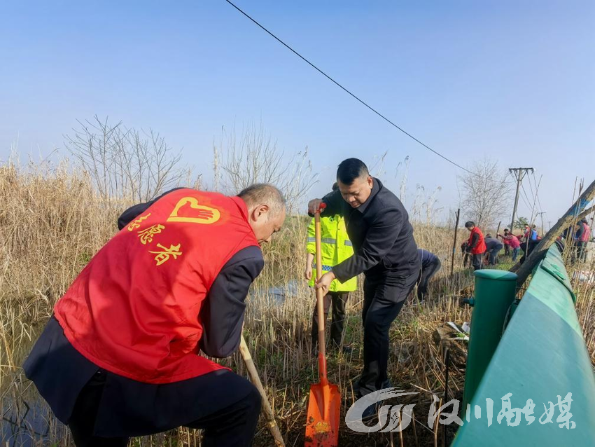 植树现场春意盎然、大家干劲十足。镇党委班子成员发挥带头作用,手持铁锹、锄头等工具,分工协作、密切配合。扶苗正干、挥锹培土、踩实压紧、提水浇灌……和煦的春风中勾勒出一幅生动的“干群同心植绿图”。经过近两个小时的辛勤劳作,百余株柳树苗整齐地挺立在河堤两岸,为春日的老观湖村增添了一道亮丽的风景线。