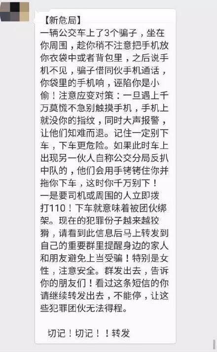 曾有一则关于“公交车上3骗子诬陷乘客偷手机”的提醒在网上流传:
