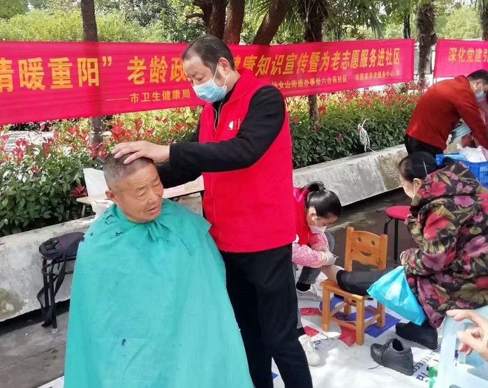 来自汉川居家养老服务中心的工作人员免费为老年人开展理发、修脚等为老服务活动,并就有关居家养老服务项目和内容提供讲解。