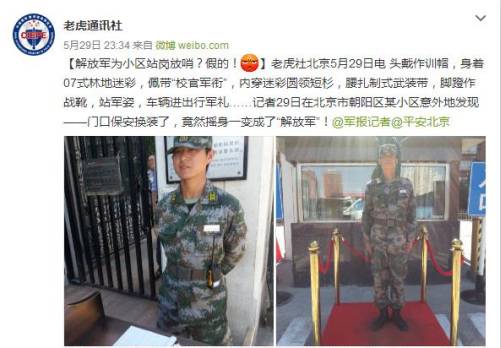 今年5月,有网友发表题为《解放军为小区站岗放哨?假的!》的微博,称北京朝阳区某小区保安换装了,竟然摇身一变成了“解放军”。