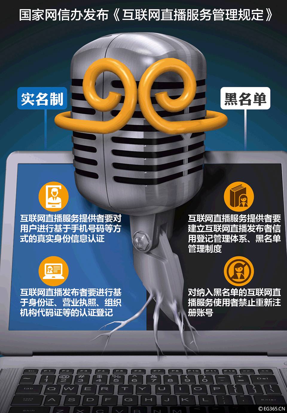 本月12日,文化部印发《网络表演经营活动管理办法》,重拳整治网络直播生态,并将于2017年1月1日起施行。主要内容如下: