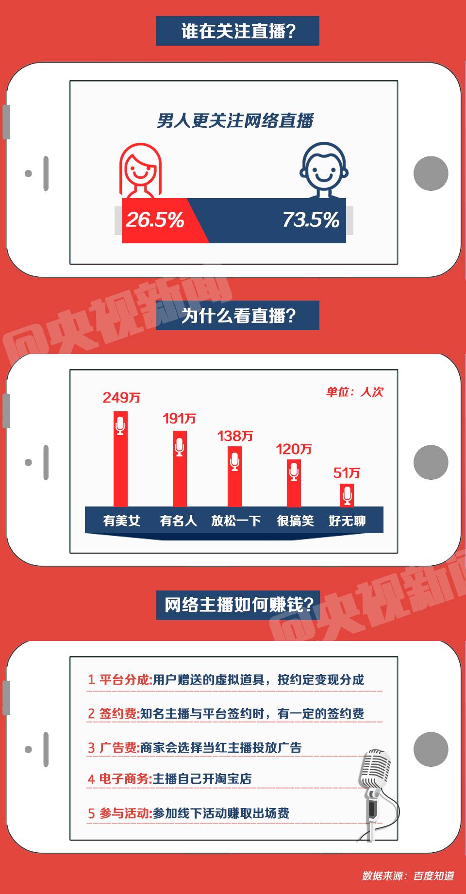 网络直播是今年流行起来的新生事物,但是在发展过程中,一些“主播”为了博取点击量,获取点赞数,以低俗、色情等违法违规内容吸引关注,致使网络直播乱象不断。