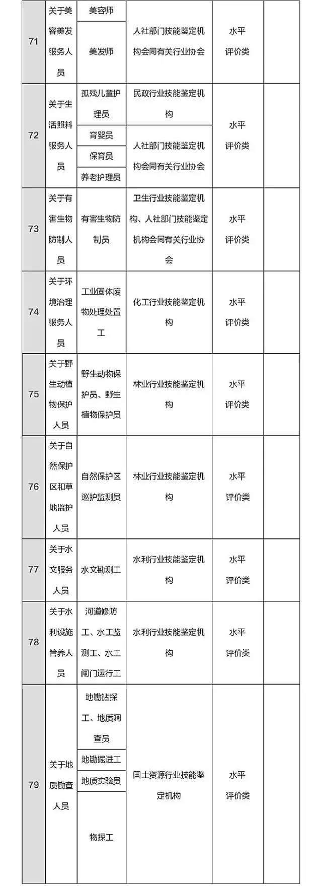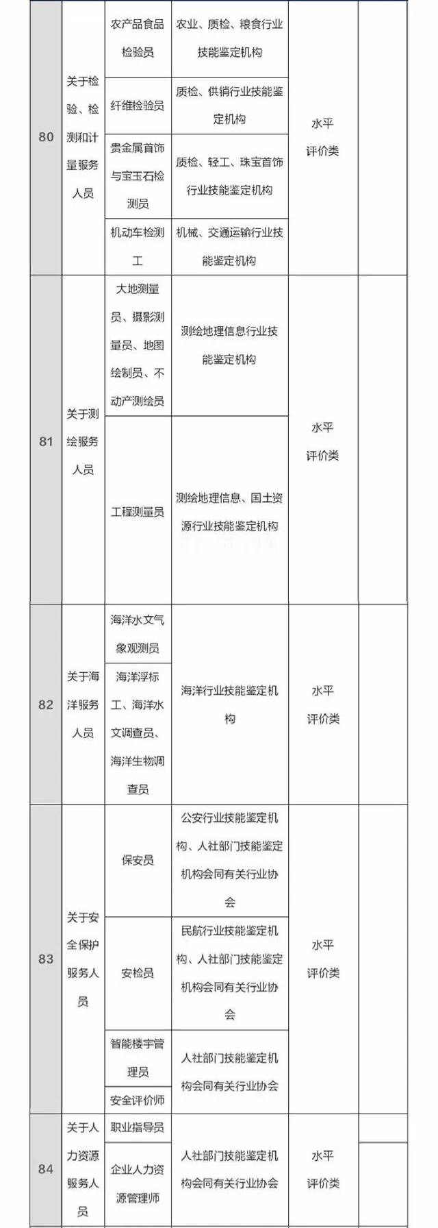 本次取消的职业资格许可和认定事项中,专业技术人员职业资格7项,其中准入类3项,水平评价类4项,涉及公路水运工程监理、防雷、管理咨询等领域;技能人员职业资格107项,均为水平评价类,涉及机械设备、食品加工和农业、文化、轻工等多个领域。具体来看,电影电视演员、摄影师、调酒师、公共营养师等职业资格许可和认定均被取消。(点击此处查看前六批名单)