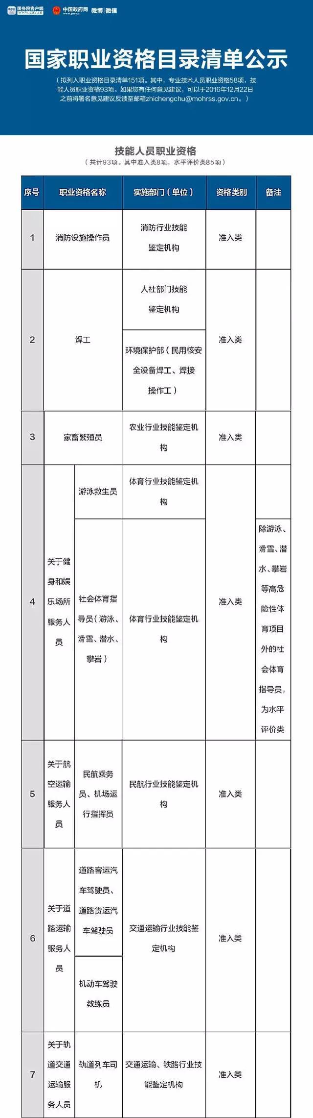 就在本月16日,人社部公示了国家职业资格目录清单,拟列入职业资格目录清单151项。其中,专业技术人员职业资格58项,技能人员职业资格93项。