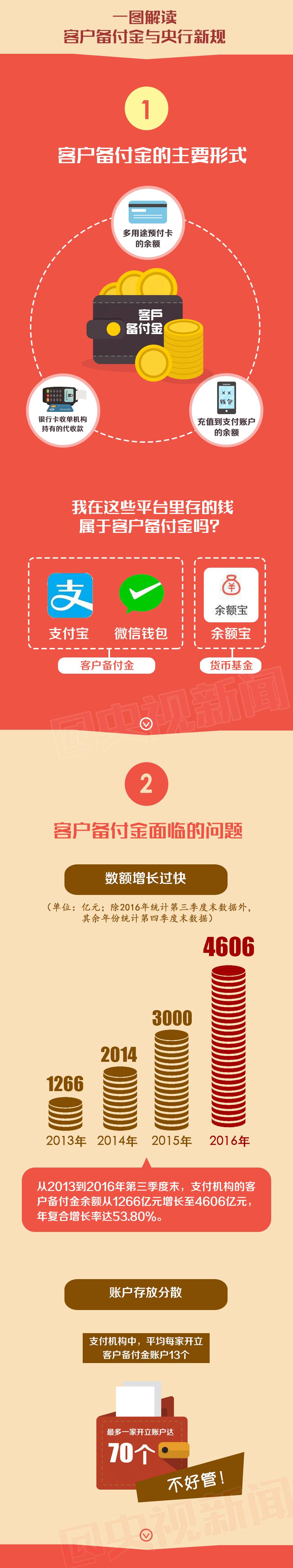 按照央行要求,4月17日起,支付机构将部分客户备付金交存至指定机构专用存款账户,首次交存的平均比例为20%左右,最终将实现全部客户备付金集中存管。