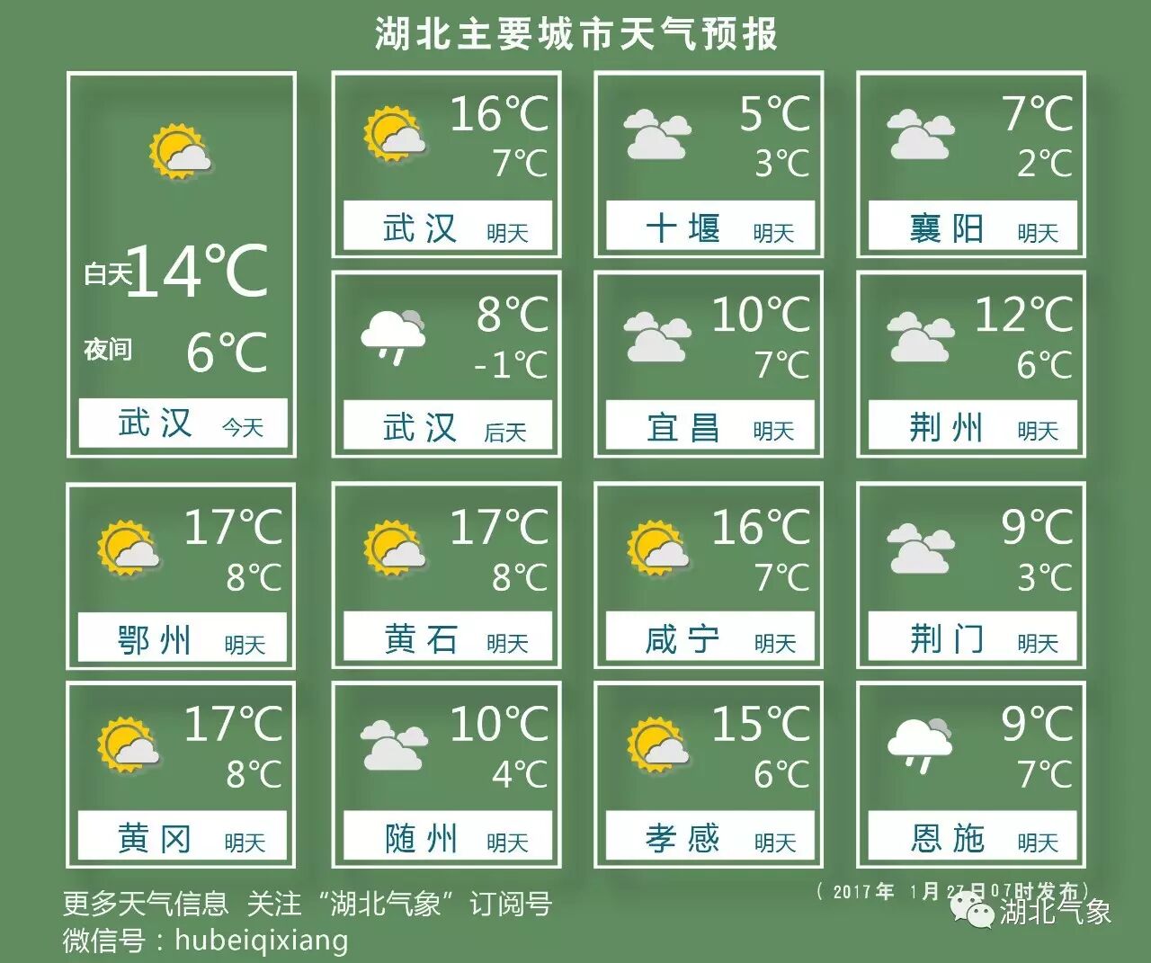 1月26日08时~27日08时,恩施地区阴天有4县市出现小雨;其他地区晴天转多云。最高气温鄂西北西部和鄂西南西部8~12℃,其他地区14~17℃;最低气温江汉平原南部和鄂东南局部4~7℃,其他大部地区0~4℃。